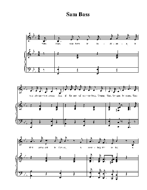 Sam Bass was born in Indiana, it was his native home,And at the age of seventeen young Sam began to roam.Sam first came out to Texas a cowboy for to be,—A kinder-hearted fellow you seldom ever see.Sam used to deal in race stock, one called the Denton mare,He matched her in scrub races, and took her to the Fair.Sam used to coin the money and spent it just as free,He always drank good whiskey wherever he might be.Sam left the Collin's ranch in the merry month of MayWith a herd of Texas cattle the Black Hills for to see,Sold out in Custer City and then got on a spree,—A harder set of cowboys you seldom ever see.On their way back to Texas they robbed the U.P. train,And then split up in couples and started out again.Joe Collins and his partner were overtaken soon,With all their hard-earned money they had to meet their doom.Sam made it back to Texas all right side up with care;Rode into the town of Denton with all his friends to share.Sam's life was short in Texas; three robberies did he do,He robbed all the passenger, mail, and express cars too.Sam had four companions—four bold and daring lads—They were Richardson, Jackson, Joe Collins, and Old Dad;Four more bold and daring cowboys the rangers never knew,They whipped the Texas rangers and ran the boys in blue.Sam had another companion, called Arkansas for short,Was shot by a Texas ranger by the name of Thomas Floyd;Oh, Tom is a big six-footer and thinks he's mighty fly,But I can tell you his racket,—he's a deadbeat on the sly.Jim Murphy was arrested, and then released on bail;He jumped his bond at Tyler and then took the train for Terrell;But Mayor Jones had posted Jim and that was all a stall,'Twas only a plan to capture Sam before the coming fall.Sam met his fate at Round Rock, July the twenty-first,They pierced poor Sam with rifle balls and emptied out his purse.Poor Sam he is a corpse and six foot under clay,And Jackson's in the bushes trying to get away.Jim had borrowed Sam's good gold and didn't want to pay,The only shot he saw was to give poor Sam away.He sold out Sam and Barnes and left their friends to mourn,—Oh, what a scorching Jim will get when Gabriel blows his horn.And so he sold out Sam and Barnes and left their friends to mourn,Oh, what a scorching Jim will get when Gabriel blows his horn.Perhaps he's got to heaven, there's none of us can say,But if I'm right in my surmise he's gone the other way.