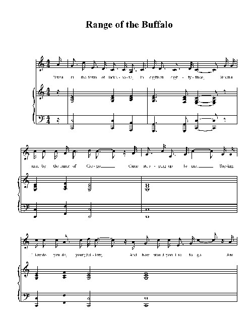 Come all you jolly fellows and listen to my song,There are not many verses, it will not detain you long;It's concerning some young fellows who did agree to goAnd spend one summer pleasantly on the range of the buffalo.It happened in Jacksboro in the spring of seventy-three,A man by the name of Crego came stepping up to me,Saying, "How do you do, young fellow, and how would you like to goAnd spend one summer pleasantly on the range of the buffalo?""It's me being out of employment," this to Crego I did say,"This going out on the buffalo range depends upon the pay.But if you will pay good wages and transportation too,I think, sir, I will go with you to the range of the buffalo.""Yes, I will pay good wages, give transportation too,Provided you will go with me and stay the summer through;But if you should grow homesick, come back to Jacksboro,I won't pay transportation from the range of the buffalo."It's now our outfit was complete—seven able-bodied men,With navy six and needle gun—our troubles did begin;Our way it was a pleasant one, the route we had to go,Until we crossed Pease River on the range of the buffalo.It's now we've crossed Pease River, our troubles have begun.The first damned tail I went to rip, Christ! how I cut my thumb!While skinning the damned old stinkers our lives wasn't a show,For the Indians watched to pick us off while skinning the buffalo.He fed us on such sorry chuck I wished myself most dead,It was old jerked beef, croton coffee, and sour bread.Pease River's as salty as hell fire, the water I could never go,—O God! I wished I had never come to the range of the buffalo.Our meat it was buffalo hump and iron wedge bread,And all we had to sleep on was a buffalo robe for a bed;The fleas and gray-backs worked on us, O boys, it was not slow,I'll tell you there's no worse hell on earth than the range of the buffalo.Our hearts were cased with buffalo hocks, our souls were cased with steel,And the hardships of that summer would nearly make us reel.While skinning the damned old stinkers our lives they had no show,For the Indians waited to pick us off on the hills of Mexico.The season being near over, old Crego he did sayThe crowd had been extravagant, was in debt to him that day,—We coaxed him and we begged him and still it was no go,—We left old Crego's bones to bleach on the range of the buffalo.Oh, it's now we've crossed Pease River and homeward we are bound,No more in that hell-fired country shall ever we be found.Go home to our wives and sweethearts, tell others not to go,For God's forsaken the buffalo range and the damned old buffalo.