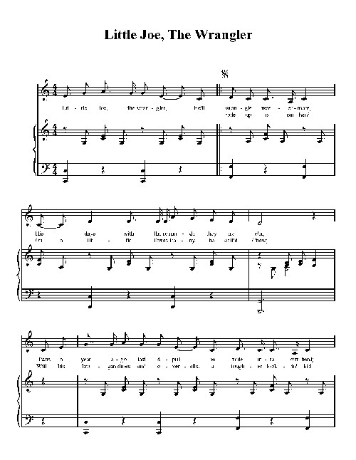 It's little Joe, the wrangler, he'll wrangle never more,His days with the remuda they are o'er;'Twas a year ago last April when he rode into our camp,—Just a little Texas stray and all alone,—On a little Texas pony he called "Chaw."With his brogan shoes and overalls, a tougher kidYou never in your life before had saw.His saddle was a Texas "kak," built many years ago,With an O.K. spur on one foot lightly swung;His "hot roll" in a cotton sack so loosely tied behind,And his canteen from his saddle-horn was swung.He said that he had to leave his home, his pa had married twice;And his new ma whipped him every day or two;So he saddled up old Chaw one night and lit a shuck this way,And he's now trying to paddle his own canoe.He said if we would give him work, he'd do the best he could,Though he didn't know straight up about a cow;So the boss he cut him out a mount and kindly put him on,For he sorta liked this little kid somehow.Learned him to wrangle horses and to try to know them all,And get them in at daylight if he could;To follow the chuck-wagon and always hitch the team,And to help the cocinero rustle wood.We had driven to the Pecos, the weather being fine;We had camped on the south side in a bend;When a norther commenced blowin', we had doubled up our guard,For it taken all of us to hold them in.Little Joe, the wrangler, was called out with the rest;Though the kid had scarcely reached the herd,When the cattle they stampeded, like a hailstorm long they fled,Then we were all a-ridin' for the lead.'Midst the streaks of lightin' a horse we could see in the lead,'Twas Little Joe, the wrangler, in the lead;He was riding Old Blue Rocket with a slicker o'er his head,A tryin' to check the cattle in their speed.At last we got them milling and kinda quieted down,And the extra guard back to the wagon went;But there was one a-missin' and we knew it at a glance,'Twas our little Texas stray, poor Wrangling Joe.The next morning just at day break, we found where Rocket fell,Down in a washout twenty feet below;And beneath the horse, mashed to a pulp,—his spur had rung the knell,—Was our little Texas stray, poor Wrangling Joe.