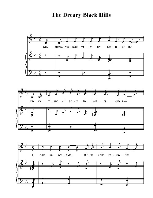 Come all you brave young shanty boys, and list while I relateConcerning a young shanty boy and his untimely fate;Concerning a young river man, so manly, true and brave;'Twas on a jam at Gerry's Rock he met his watery grave;'Twas on a Sunday morning as you will quickly hear,Our logs were piled up mountain high, we could not keep them clear.Our foreman said, "Come on, brave boys, with hearts devoid of fear,We'll break the jam on Gerry's Rock and for Agonstown we'll steer."Now, some of them were willing, while others they were not,All for to work on Sunday they did not think they ought;But six of our brave shanty boys had volunteered to goAnd break the jam on Gerry's Rock with their foreman, young Monroe.They had not rolled off many logs 'till they heard his clear voice say,"I'd have you boys be on your guard, for the jam will soon give way."These words he'd scarcely spoken when the jam did break and go,Taking with it six of those brave boys and their foreman, young Monroe.Now when those other shanty boys this sad news came to hear,In search of their dead comrades to the river they did steer;Six of their mangled bodies a-floating down did go,While crushed and bleeding near the banks lay the foreman, young Monroe.They took him from his watery grave, brushed back his raven hair;There was a fair form among them whose cries did rend the air;There was a fair form among them, a girl from Saginaw town.Whose cries rose to the skies for her lover who'd gone down.Fair Clara was a noble girl, the river-man's true friend;She and her widowed mother lived at the river's bend;And the wages of her own true love the boss to her did pay,But the shanty boys for her made up a generous sum next day.They buried him quite decently; 'twas on the first of May;Come all you brave young shanty boys and for your comrade pray.Engraved upon the hemlock tree that by the grave does growIs the aged date and the sad fate of the foreman, young Monroe.Fair Clara did not long survive, her heart broke with her grief;And less than three months afterwards Death came to her relief;And when the time had come and she was called to go,Her last request was granted, to be laid by young Monroe.Come all you brave young shanty boys, I'd have you call and seeTwo green graves by the river side where grows a hemlock tree;The shanty boys cut off the wood where lay those lovers low,—'Tis the handsome Clara Vernon and her true love, Jack Monroe.THE DREARY BLACK HILLS