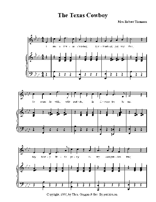 My lover, he is a cowboy, he's brave and kind and true,He rides a Spanish pony, he throws a lasso, too;And when he comes to see me our vows we do redeem,He throws his arms around me and thus begins to sing:"Ho, I'm a jolly cowboy, from Texas now I hail,Give me my quirt and pony, I'm ready for the trail;I love the rolling prairies, they're free from care and strife,Behind a herd of longhorns I'll journey all my life."When early dawn is breaking and we are far away,We fall into our saddles, we round-up all the day;We rope, we brand, we ear-mark, I tell you we are smart,And when the herd is ready, for Kansas then we start."Oh, I am a Texas cowboy, lighthearted, brave, and free,To roam the wide, wide prairie, 'tis always joy to me.My trusty little pony is my companion true,O'er creeks and hills and rivers he's sure to pull me through."When threatening clouds do gather and herded lightnings flash,And heavy rain drops splatter, and rolling thunders crash;What keeps the herd from running, stampeding far and wide?The cowboy's long, low whistle and singing by their side."When in Kansas City, our boss he pays us up,We loaf around the city and take a parting cup;We bid farewell to city life, from noisy crowds we come,And back to dear old Texas, the cowboy's native home."Oh, he is coming back to marry the only girl he loves,He says I am his darling, I am his own true love;Some day we two will marry and then no more he'll roam,But settle down with Mary in a cozy little home."Ho, I'm a jolly cowboy, from Texas now I hail,Give me my bond to Mary, I'll quit the Lone Star trail.I love the rolling prairies, they're free from care and strife,But I'll quit the herd of longhorns for the sake of my little wife."
