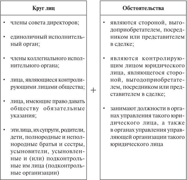 ✓ Сделка, в совершении которой имеется заинтересованность (сделка с заинтересованностью), – сделка, в совершении которой имеется заинтересованность члена совета директоров (наблюдательного совета) общества, единоличного исполнительного органа, члена коллегиального исполнительного органа общества или лица, являющегося контролирующим лицом общества, либо лица, имеющего право давать обществу обязательные для него указания (п. 1 ст. 81 Закона об АО, п. 1. ст. 45 закона об ООО).