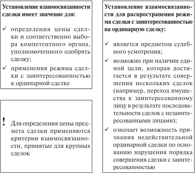 Несколько взаимосвязанных сделок, направленных на достижение единого результата и совершенных совместно несколькими лицами, у части из которых имеется заинтересованность в их совершении, являются сделками с заинтересованностью, а лицо, заинтересованное в совершении хотя бы одной из входящих в круг взаимосвязанных сделок, должно рассматриваться как лицо, заинтересованное в совершении всех взаимосвязанных сделок (постановление Президиума ВАС РФ от 12 апреля 2011 г. № 15749/10 по делу № А73-225/2009).