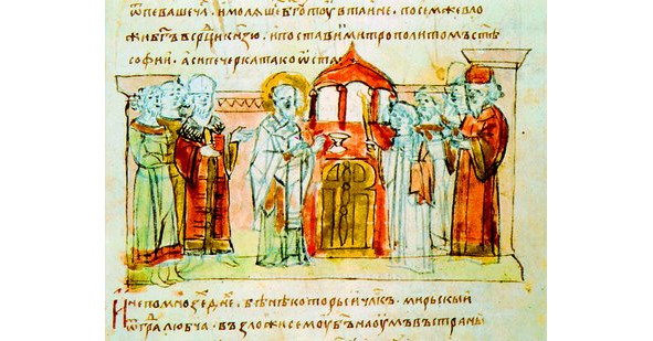 Согласно Новгородской третьей летописи за 988 год имеются следующие сведения: «Въ лѣто 6496. Крестися великiй князь Владимеръ Святославичь, и взя у Фотiя патрiарха перваго митрополита Кiеву Леона, а Новуграду епископа Iоакима Корсунскаго… И прiиде епископъ Iоакимъ, и требища разори и перуна посѣче, что въ Великомъ Новѣградѣ стоялъ на Перыни, и повелѣ повлещи въ Волховъ»2. Поставление Иоакима в 988 году подтверждает Рогожский летописец.