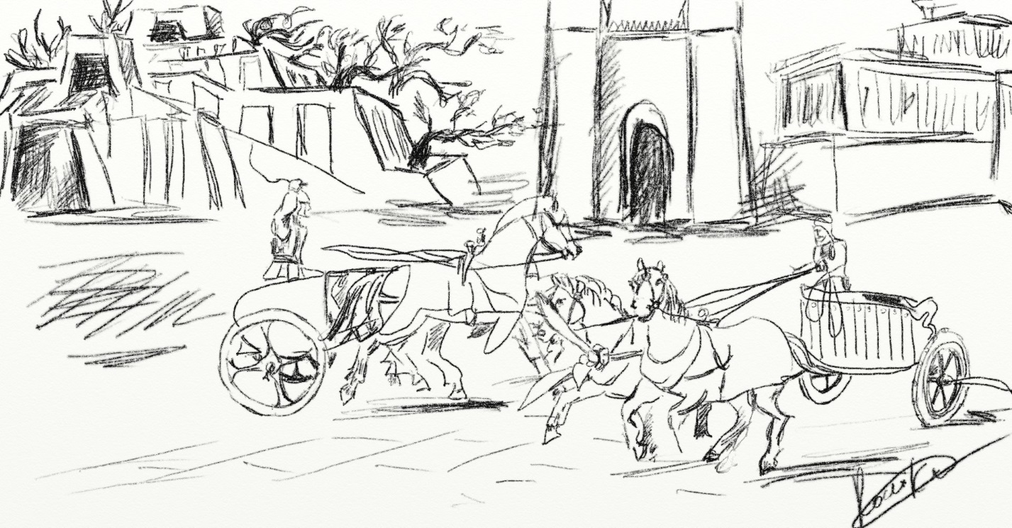 Выйдя из дома, я на площади чуть было не столкнулся с колесницей. Вот только мне не хватало под лошадей попасть. Это не мне, это Тебадию, нагадали смерь от них, меня же боги милуют. Не Ахура Мазда, взошедший сейчас на вершины, а старые, древние, о которых не говорят, которых боятся.