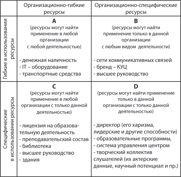 Для оценки располагаемых КУЦ и требуемых ресурсов используем модель «Матрицы специфичности ресурсов» (рис. 1.3)[5]. Очевидно, что в настоящее время, в условиях динамично меняющегося сложного окружения организации преимущественно должны развивать организационно-гибкие ресурсы (квадрант А и С). Этим самым обеспечивая свою способность гибко реагировать на изменения во внешнем окружении.