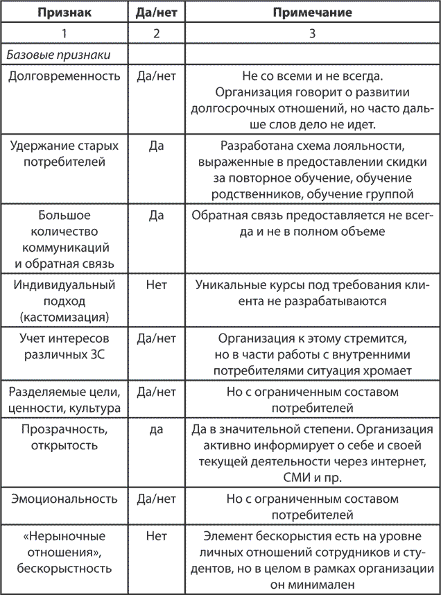 Таблица 1.1. Признаки развития маркетинга взаимоотношений в КУЦ