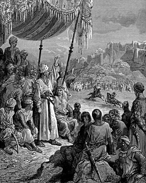 Турнир, устроенный во время перемирия между христианами и мусульманами. В поединках меряются силами лучшие мусульманские воины и прославленные рыцари-крестоносцы. Гравюра на дереве Густава Доре