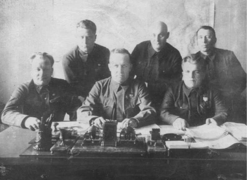 Октябрь 1941 г. Сидят слева направо: Суходольский В.Н., Жаворонков В.Г., Чмутов Н.И. Стоят: Барчуков И.М., Шарапов Н.И., Калиновский А.