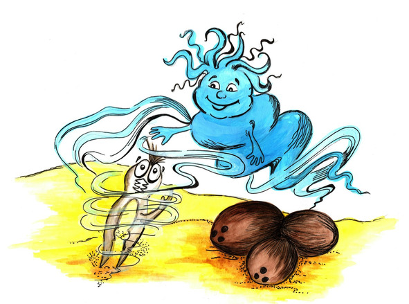 – Эй, вы, там! – недовольно гаркнуло Солнце, о котором уже все успели забыть. – Конечно, это не моё дело, но за вами по пятам следует злющий-презлющий Король-Ветер. Он настолько зол, что может запросто сдуть ваш островок вместе с пальмой… Конечно, я не намерено вас выдавать, – ехидно добавило оно. – Но ведь всякое может случиться. Например, настроение испортится. Или скучно станет… Хотя наблюдать за тем, как мечется Король-Ветер, уже само по себе удовольствие.