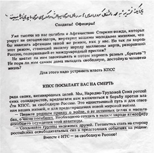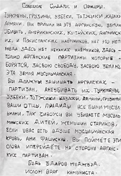 Только одних листовок антисоветского характера, особенно Народно-трудового союза, других подобных организаций, бандформирований, исполненных от руки, в окружении наших войск разбрасывалось тысячи штук. Изменилась и тактика их распространения. Если в 1980-1981 гг. листовки разбрасывались преимущественно в окружении советских военных объектов, то в последующие годы нашего нахождения в Афганистане противник стремился повысить надежность их доведения до советских военнослужащих путем личного вручения в процессе контактов, подбрасывания непосредственно в наши транспортные средства и на территорию военных объектов. При разгроме одной из баз мятежников было обнаружено более пяти тысяч спичечных этикеток с карикатурными лозунгами антисоветского содержания. Вместе с ними были и разного рода брошюры, красочно оформленные буклеты, спички с соответствующими этикетками.