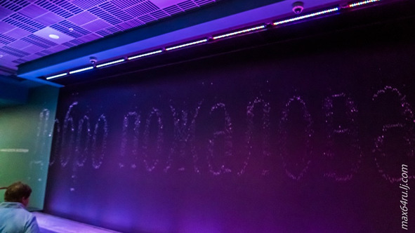 Это стена, на фоне которой повинуясь воле компьютера падают капли воды, создавая летящие надписи «Добро пожаловать», «Москвариум» и др. Впечатляет, нигде такого не видел.