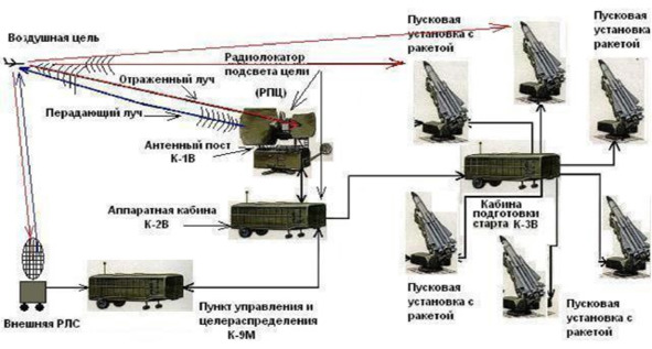 Передающая антенна радиолокатора подсвета цели (РПЦ), в состав которой входит антенный пост К-1В, излучает в пространство передающий луч. Этот луч отражается от воздушной цели, возвращается назад и попадает на приёмную антенну. Информация о воздушной цели, её скорость, удаление, угловые координаты поступают в аппаратную кабину К-2В, которая также входит в состав РПЦ. Поскольку передающий и приемный луч очень узкий, то такой «иголкой» обнаружить воздушную цель на большом расстоянии очень сложно. Поэтому, предварительные данные о воздушной цели поступают от внешней РЛС, через кабину К9М в РПЦ. Как только луч от РПЦ найдет цель, начинается её сопровождение в автоматическом режиме и данные от внешней РЛС больше не нужны.
