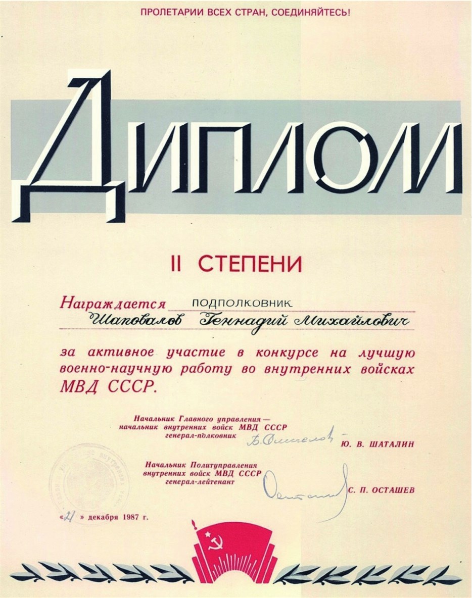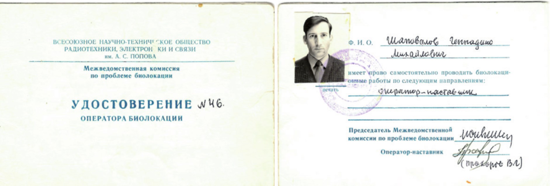 За активную работу с межведомственной комиссией по проблеме биолокации при Центральном правлении ВТО радиотехники и связи им. А. С. Попова, успешную сдачу программы подготовки операторов биолокации председателем межведомственной комиссии Н. Н. Сочевановым Г. М. Шаповалову было выдано удостоверение оператора-наставника биолокации за № 46.