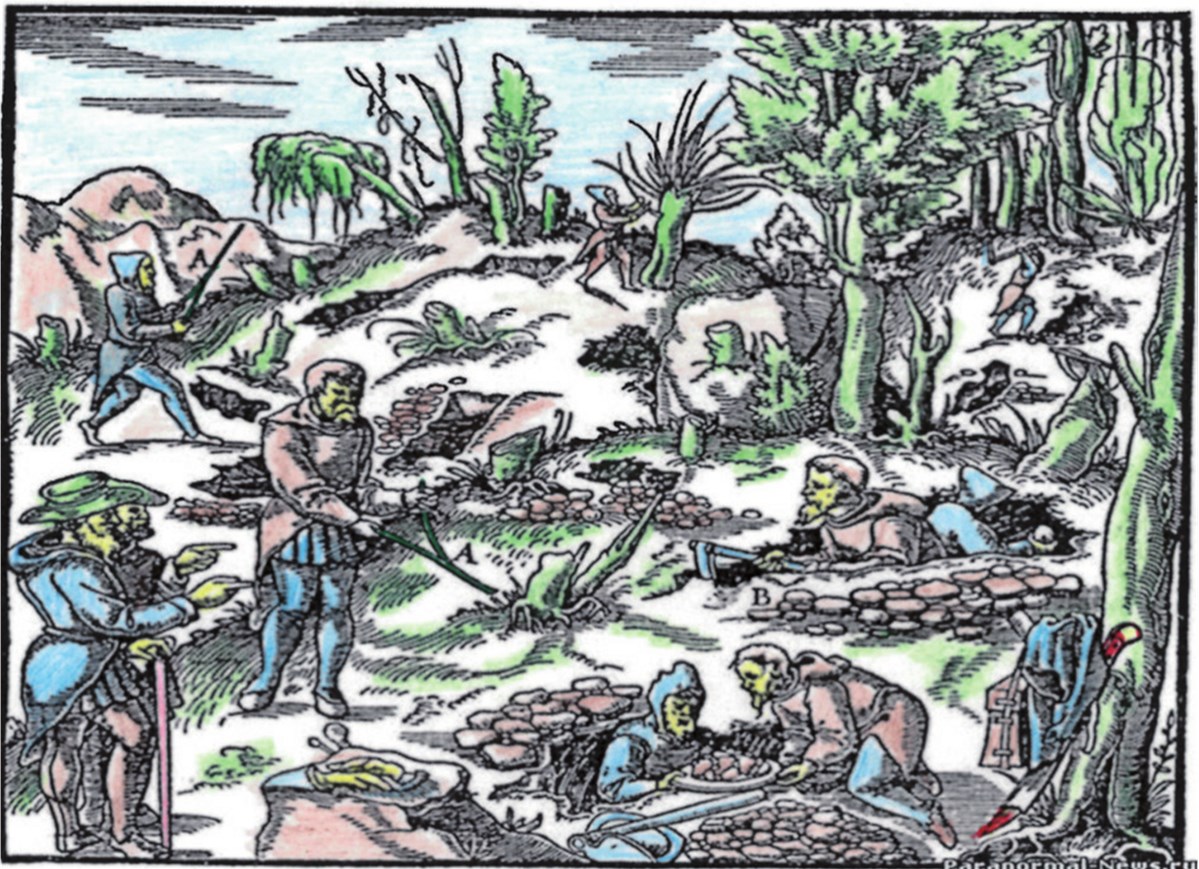 Рис. 1. Поиск руды или воды с помощью «лозы», затем отрывание места срабатывания «лозы» и, наконец, определение наличия руды (воды)