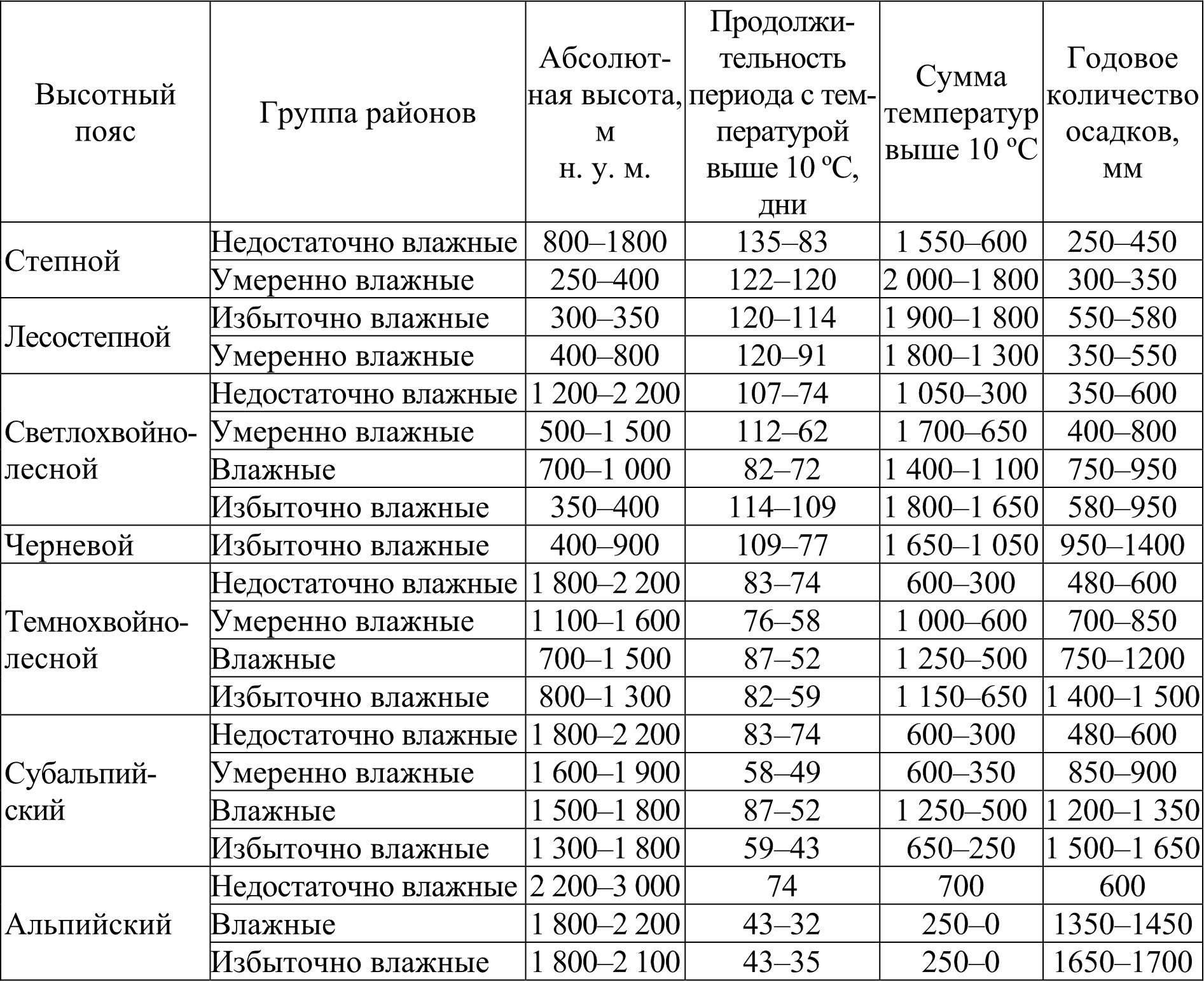 РастительностьРастительность исследуемой территории весьма разнообразна и неоднородна, что определяется, во-первых, высотной поясностью, во-вторых, – положением на южной границе бореальной и в северной части суббореальной широтной ландшафтной зоны: контакт бореальных (таежных и подтаежных) и суббореальных (лесостепных и степных) ландшафтов. Контрастный климатический режим макросклонов (особенно в Западном Саяне) определил проявление разных спектров поясности (табл. 1). На наветренных склонах господствует спектр поясности, свойственный ландшафтам барьерно-дождевого типа, с абсолютным доминированием темнохвойных лесов из пихты и кедра (при малом участии ели) и с хорошо развитым в высокогорьях поясом субальпийских лугов и редколесий, сменяющимся выше горными тундрами и альпийскими лугами.