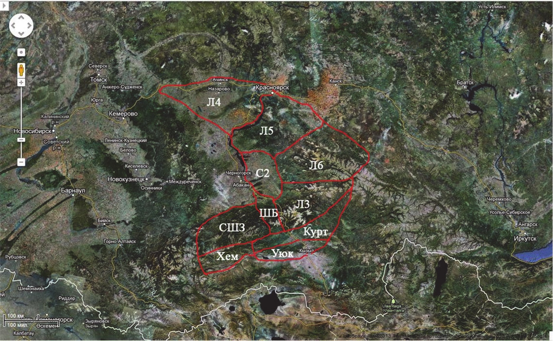Рис. 4. Районирование территории Приенисейских Саян: Л4 – левобережная часть Восточного Саяна; Л5 – правобережная часть Восточного Саяна; Л6 – центральная часть Восточного Саяна; С2 – низкогорные части Саян, примыкающие к Минусинской котловине; Л3 – правобережная северо-восточная часть Западного Саяна; ШБ – правобережная приенисейская часть Западного Саяна; СШЗ – левобережная приенисейская часть Западного Саяна; Хем – левобережная приенисейская часть южного макросклона Западного Саяна; Уюк – правобережная приенисейская часть южного макросклона Западного Саяна; Курт – правобережная центральная часть южного макросклона Западного Саяна