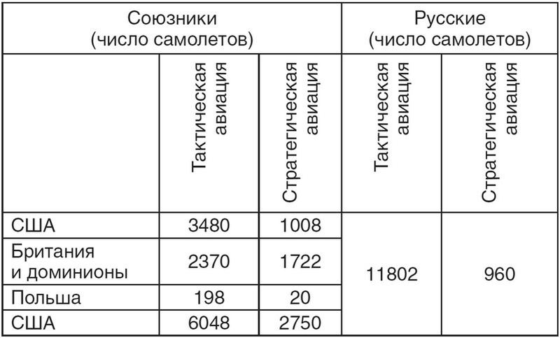 Преимущество в количестве советских самолетов будет носить временный характер и компенсируется чрезвычайно превосходящей эффективностью Союзных ВВС, в особенности стратегической авиацией. Однако после ряда военных операций наш недостаток в подменных самолетах и экипажах серьезно ослабит нашу воздушную силу.