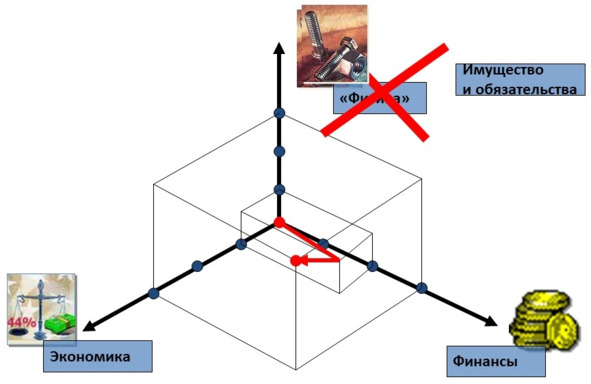 Любое наше действие вызывает движение по трем этим осям, причем необязательно одновременно. Любая хозяйственная операция, любой чих в компании вызывает движение по одному из трех измерений.