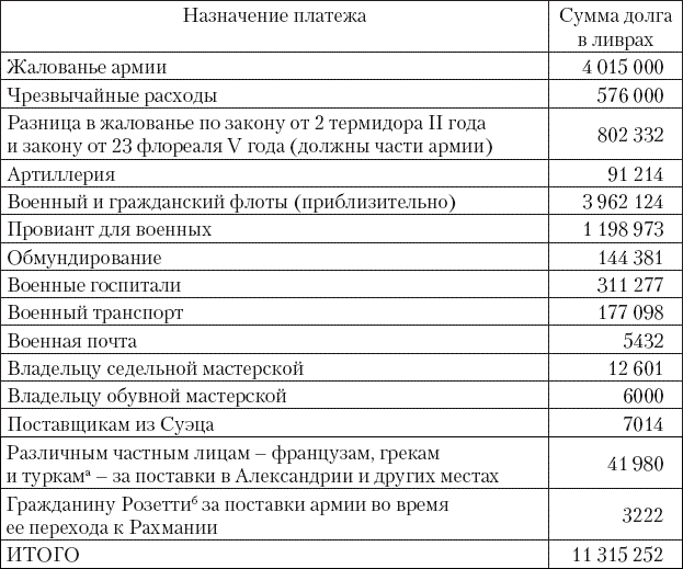 Что касается оценки ситуации третьим из главных финансовых чиновников армии – главным казначеем Жан-Пьером Дором, то лучше всего ее иллюстрирует приложенный им к письму Клебера обзор долгов армии на 23 августа 1799 г., то есть на день отъезда Бонапарта: