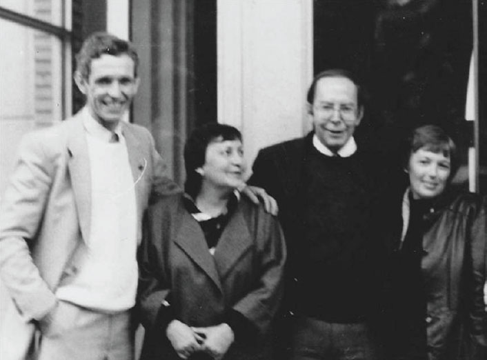 Д. А. Хопвуд и К. Ф. Четер с визитом в Москве, 1989 год. По бокам от Дэвида слева Нора Мкртумян, справа Наташа Ломовская. Посетили Всесоюзный Научно-исследовательский институт антибиотиков.
