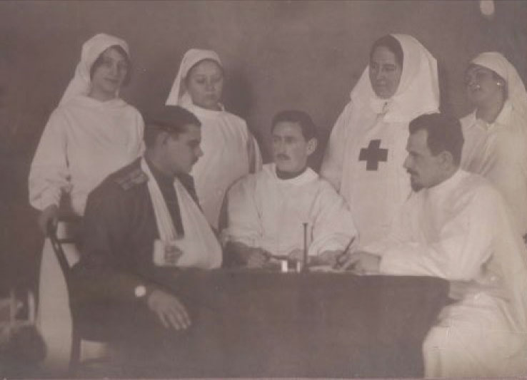 Мария Николаевна Шаскольская – медсестра в лазарете, представитель общества «Красного креста». Подпись на обороте с твердым знаком: 21 ноября 1914 года. Лазарет квартиро-нанимателей дома (неразб.) в Москве. Слева направо: Юлия Фёдоровна Бреннер, прапорщик Давыдов, Татьяна Павловна Белоруссова, врач Григорий Васильевич Макаренко, медсестра М. Н. Шаскольская, врач Александр Петрович Боголюбов, Надежда Филимоновна Леоненко.