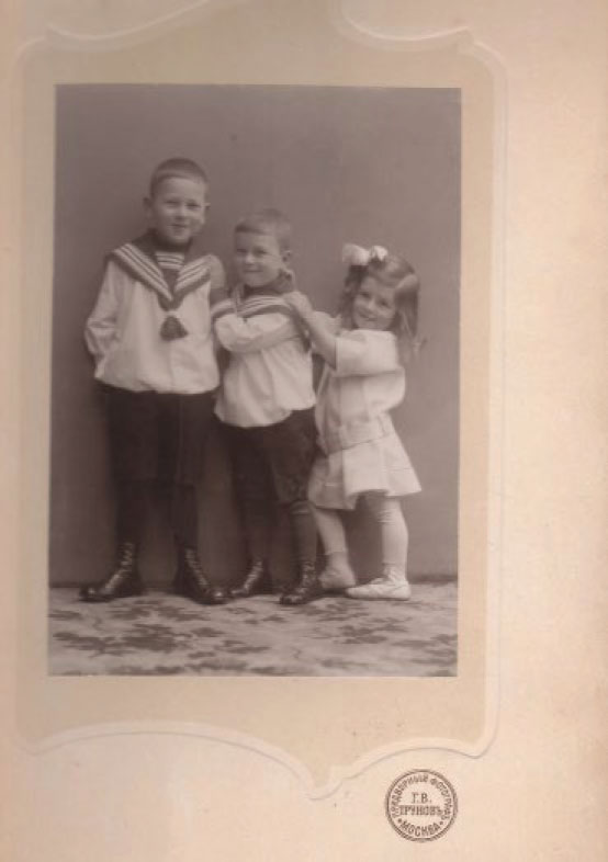 Братья Шаскольские Борис, Дмитрий и Виктор, сыновья Марии Николаевны и Владимира Борисовича Шаскольских. Виктор снят в наряде девочки, о рождении которой так мечтала Мария Николаевна. Внизу печать придворного фотографа. Предположительно, начало 10-х годов 20-го века.