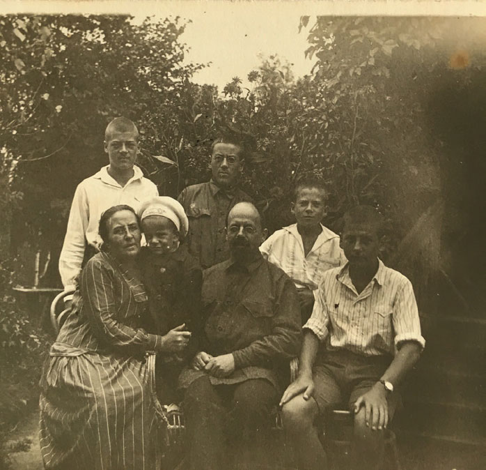 Середина двадцатых. Сидят Мария Николаевна Шаскольская с младшим сыном Николаем, Владимир Борисович Шаскольский и Виктор. Стоят Дмитрий, Борис и Глеб Шаскольские. Ну-ка, попробуйте вырастить в пред- и послереволюционные годы пятерых сыновей! Мой (Н. Л.) папа Дмитрий Владимирович обмолвился, что в эти годы среди братьев была установлена строгая очередность, кому подбирать со сковородки кусочком хлеба остатки масла.