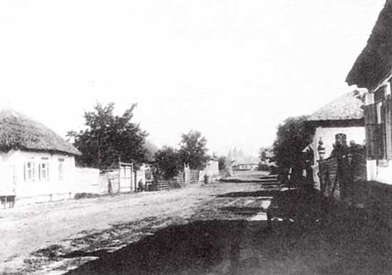 Улица в Острогожске с домом (второй слева с палисадником), в котором провел детские годы И. Н. Крамской. 1908 Фотография