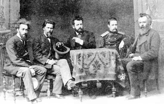 Слева направо: К.А. Савицкий, И.Н. Крамской, Н.А. Ярошенко, И.И. Шишкин.