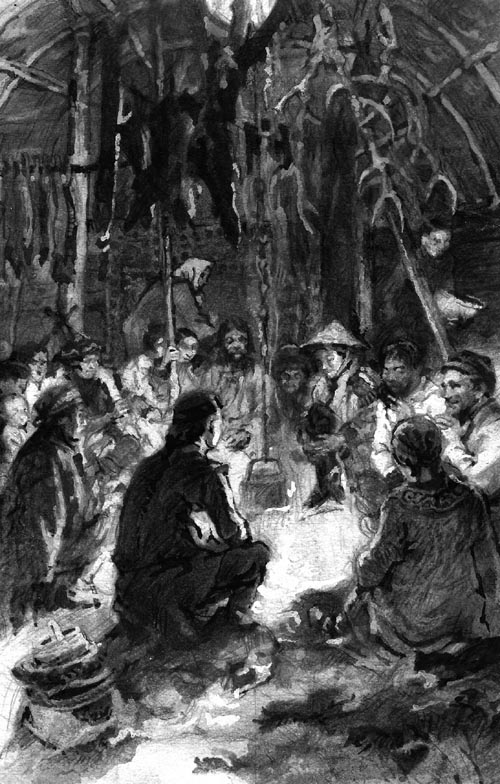 Туземные женщины быстро привели покинутую юрту в жилой вид, подмели пол и поправили корье на крыше.