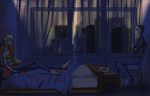 Отряд из пяти человек выстроился по периметру комнаты. Окно в спальню было открыто. Дул лёгкий ветер, приподнимая занавески. Сквозь окно падали алые лучи заката, покрывая часть комнаты. На кровати в углу неподвижно сидела девушка. Если выражаться точнее, это был труп. Сомнений не было, что она мертва.