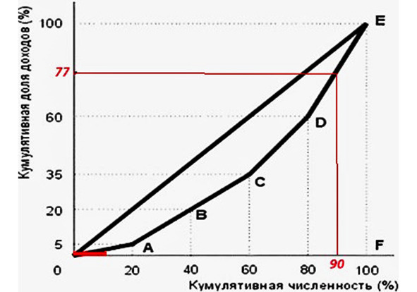 Формально для РФ эти соотношения изображаются следующей диаграммой, найти которую в открытых СМИ не представляет никакой трудности. Из неё очевидно (если отбросить заумный термин «кумулятивный», сейчас означающий что угодно от: «разъединённый, сводный, нарастающий до суммарного») и применить исходное латинское значение: cumulo – накапливаю, то накопительная величина доходов в РФ плавно и «безболезненно» возрастает от категорий «А» – 20% беднейших слоёв населения, обладающих 5% всех национальных доходов, до категории «Д-Е» представляющей 20% от общего населения страны, которая обладает 40% общего дохода страны.