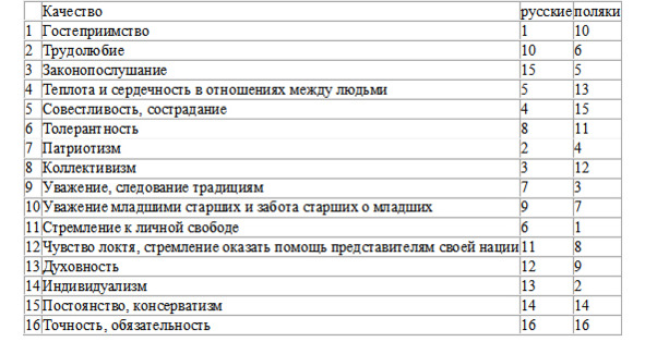 Самое интересное, что это качество специфического древнерусского менталитета слабо изменяется и в современных условиях. Я привожу рейтинговую таблицу социолога В. В. Кириенко ментальных характеристик русских и даже не немцев, а «продвинутых» в капитализм их славянских подражателей – поляков. значимого, до 16-го – наименее характерного. В ней представлены рейтинги по 16 признакам, по степени их значимости. Эти данные 2000 года показывают почти полное расхождение в характеристиках, за исключением, пожалуй, самых генетически присущих всем славянам: полному единству в непостоянстве и необязательности. Во всем остальном менталитет «приближенных» к англосаксам этносов разительно отличается от менталитета русских.