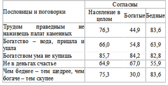 Видимо потому в современном российском обществе большинство населения согласно со старыми пословицами о бедности и богатстве. Мнения бедных и богатых слоёв общества, если и отличаются, то в гораздо меньшей степени, чем в предыдущей таблице (см. ниже таблицу по Аналитическому докладу. М.,2003).