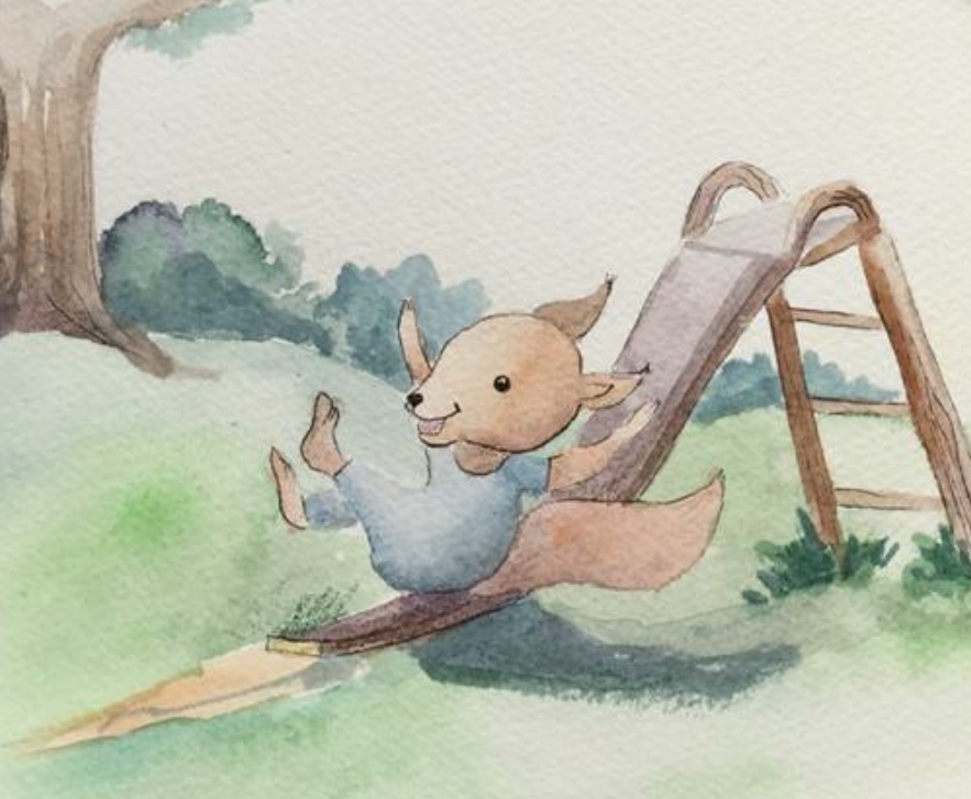 Ребята побежали к горке. Васька очень радостно катался с нее. Вдруг рядом с площадкой появился бельчонок. Он на поводке выгуливал собачку.