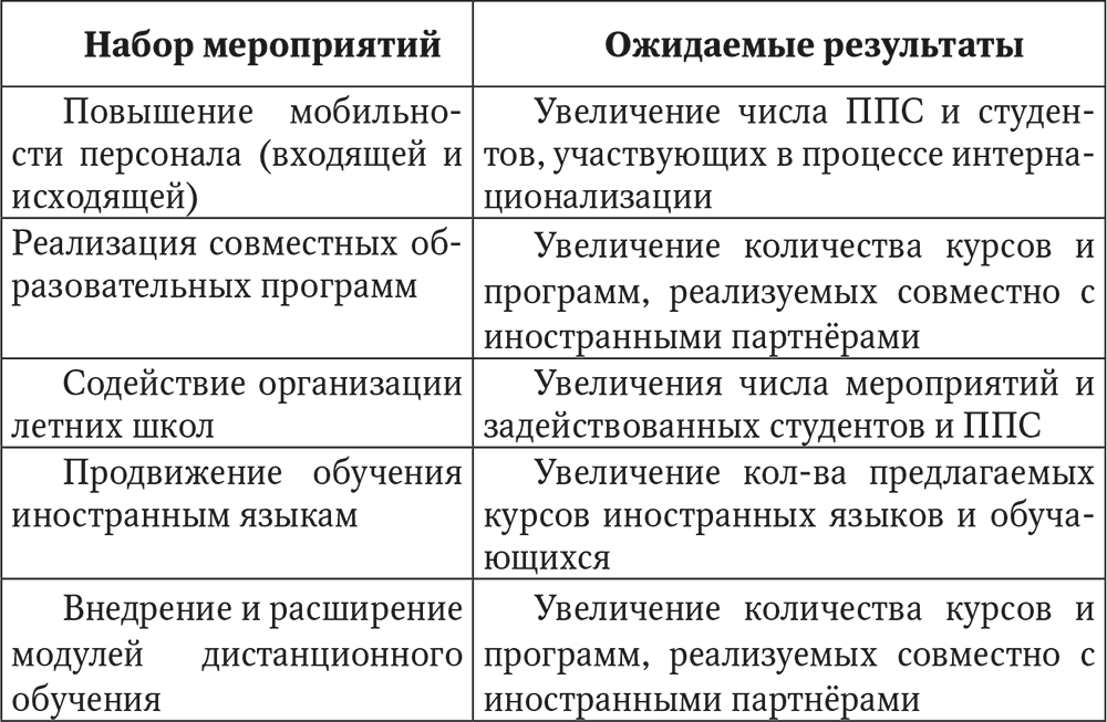 В таблице 1 продемонстрирован фрагмент рекомендуемого набора мероприятий и активностей, обеспечивающий эффекты интернационализации в сфере образовательной деятельности.