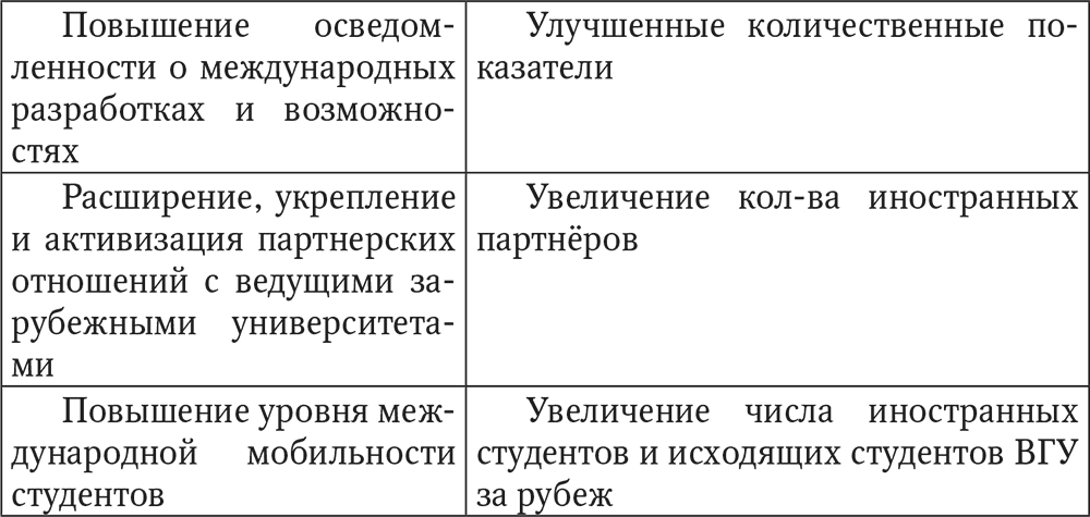 – соотнесение результатов деятельности университета с показателями региональных и международных рейтингов интернационализации в целях совершенствования образовательной и научной деятельности университета и его позиционирования в международном образовательном пространстве.