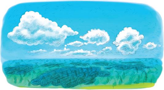 Когда Рюша выходил на полянку, тень его появлялась, а когда тропинка ныряла в чащу, исчезала. Тогда он стал с ней играть – то выбегал на солнышко, то прятался в тени деревьев, а потом смотрел на тени самих деревьев. Когда ветер раскачивал деревья, их тени тоже качались, правда невпопад с деревьями. Потом он заметил, что по цветам и травам широкой поляны лениво ползут тёмные пятна. Раньше он не обращал на них внимания, а теперь почему-то испугался. Что это такое? Наверное, тоже тени… Куда они так бесшумно скользят? И увидел, что у края поляны тени начинают подниматься вверх, прямо по деревьям, а потом… исчезают. Рюша высоко поднял голову, к самому небу, и обнаружил, что по голубой бездонной глади плывут толстобокие облака… Когда они перекрывают путь солнечному свету, по поляне скользят тени.
