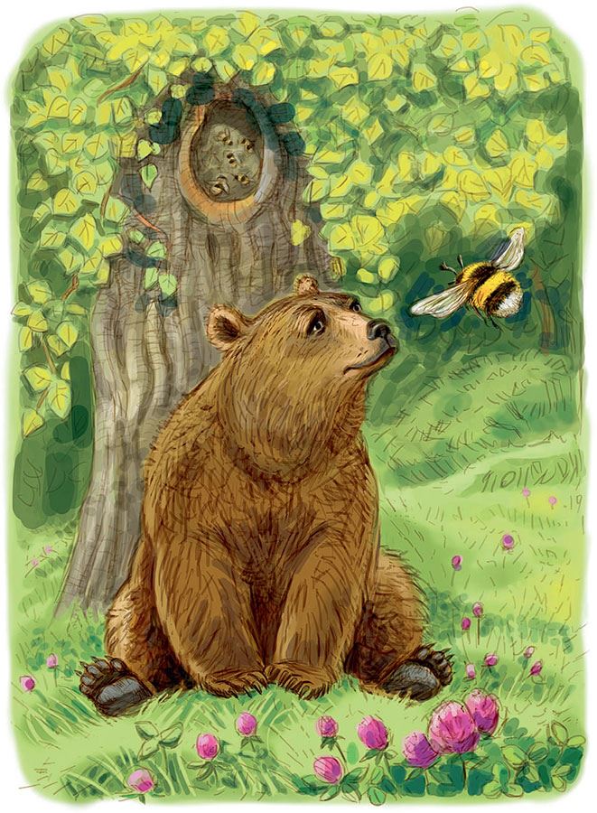 Медведь остановился и недоверчиво уставился на шмель. Подумал: «На медвежонка с крыльями похожа, и как я раньше не замечал…»