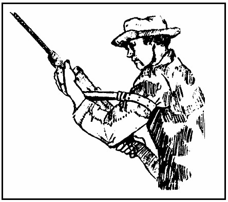 (5) Снайпер поднимает петлю на более длинной части ремня вверх по руке так, чтобы петля была возле подмышки (рис. 2-11). Затем он опускает вниз оба кожаных кольца, чтобы петля плотно обхватывала нестреляющую руку.