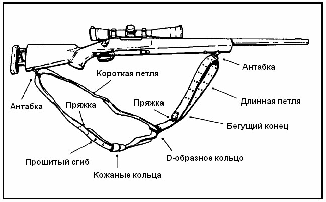 e. Регулировка ремня. Ремень помогает устойчиво удерживать винтовку, не прилагая мышечных усилий. Чем больше мышц используется для удержания винтовки, тем труднее ее удерживать неподвижно. Ремень соединяет части тела, участвующие в прицеливании, в жесткий каркас, требуя, тем самым, меньшего усилия для удержания винтовки, чем при отсутствии ремня. При правильной подгонке, ремень перераспределяет часть силы отдачи с плеча на нестреляющую руку и кисть.