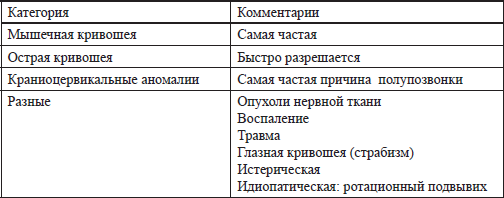 В литературе зафиксировано как минимум 80 причин кривошеи [1]. В зарубежных руководствах – принято деление кривошеи у детей на 4 категории (табл. 3.1).