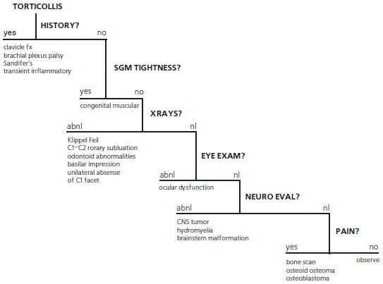 Обращает на себя внимание, что острая кривошея выделяется в отдельную группу, а ротационный подвывих атланта как идиопатическое состояние в раздел «разные». В общем дифференциально-диагностическом алгоритме обследования детей с кривошеей упоминается воспалительный вариант, а доброкачественного быстро разрешаемого состояния «острая кривошея» нет (рис. 3.1).