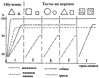 Таким образом, способность к обобщению распространена у разных видов позвоночных (она есть даже у черепах), однако наиболее развитой она оказывается у человекообразных обезьян.