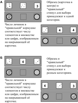 В «демонстрационной» серии впервые за весь период обучения птицы одновременно видели и цифры и множества – например, если образцом была цифра 4, то для выбора предъявляли какое-нибудь множество и цифру 4, а если образцом было множество из четырех элементов, то на карточках для выбора изображали какую-нибудь цифру и множество из четырех элементов (рис. 9А). Кроме того, вороны получали информацию о «цене» каждого стимула. В случае правильного выбора они получали дифференцированное подкрепление: находили то число личинок, которое соответствовало цифре или множеству на выбранной ими карточке. Например, и под карточкой с множеством из четырех элементов, и под цифрой 4 ворона находила 4 личинки. Для успешного решения задачи в демонстрационных сериях воронам достаточно было использовать ранее усвоенное правило выбора по соответствию с образцом – «выбирай изображение, похожее на образец».