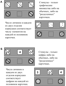 В следующем эксперименте мы выясняли, могут ли птицы оперировать усвоенной информацией – выполнять с цифрами комбинаторную операцию, аналогичную арифметическому сложению. «Слагаемые» (цифры или множества) были изображены на карточках, разделенных по диагонали чертой, так же как и соответствующие им кормушки были разделены вертикальной перегородкой на две равные части (рис. 10А). В «демонстрационной» серии использовали только множества либо на обычных, либо на «разделенных» карточках и демонстрировали соответствие числа элементов на обычных либо на «разделенных» карточках числу личинок в обычных или в «разделенных» кормушках.