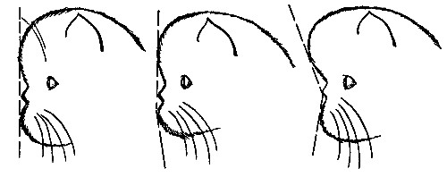 Выступание подбородка персидской кошки: слева – правильное; в центре – допустимое; справа – неправильное