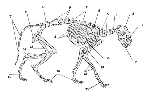 Анатомическое строение скелета кошки: 1 – лицевая часть черепа; 2 – нижняя челюсть; 3 – мозговая часть черепа; 4 – первый шейный позвонок; 5 – шейные позвонки; 6 – лопатка; 7 – грудные позвонки; 8 – ребра; 9 – поясничные позвонки; 10 – крестец; 11 – таз; 12 – хвостовые позвонки; 13 – бедренная кость; 14 – большая и малая берцовые кости; 15 – плюсна; 16 – пальцы (лапа); 17 – пясть; 18 – лучевая и локтевая кости; 19 – плечевая кость; 20 – грудинная кость