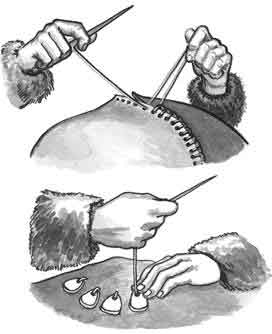 В ледниковую эпоху людям пришлось испытать тяготы настоящей снежной зимы. Холодный климат заставил подумать о более теплом облачении, чем легкие меховые накидки. Кроманьонцы носили штаны и куртки, сшивая куски шкур иглами из оленьего рога. Древний способ изготовления швейных принадлежностей не представляет секрета, существуя до настоящего времени в качестве прикладного искусства обитателей арктических зон. Кость оленя разрезалась острым каменным резцом, с широкой стороны проделывалось отверстие, затем игла зачищалась и затачивалась о шероховатый камень. Вместо ниток использовались тонкие полоски кожи и кишки животных. Шкура мамонта сначала протыкалась каменным сверлом, с тем чтобы игла легче проходила сквозь толстый материал.